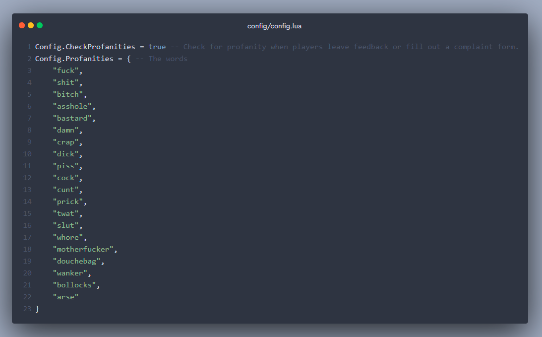 When players fill out a complaint form or write feedback, they are checked for profanity. You can add more or disable the system.