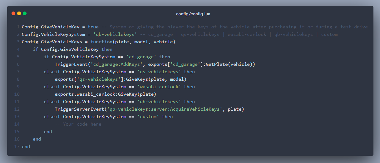 You can select the vehicle key system you are using on your server. But if you are using another vehicle key system, you can paste your export in the 'Your code here' section